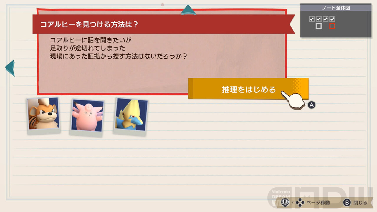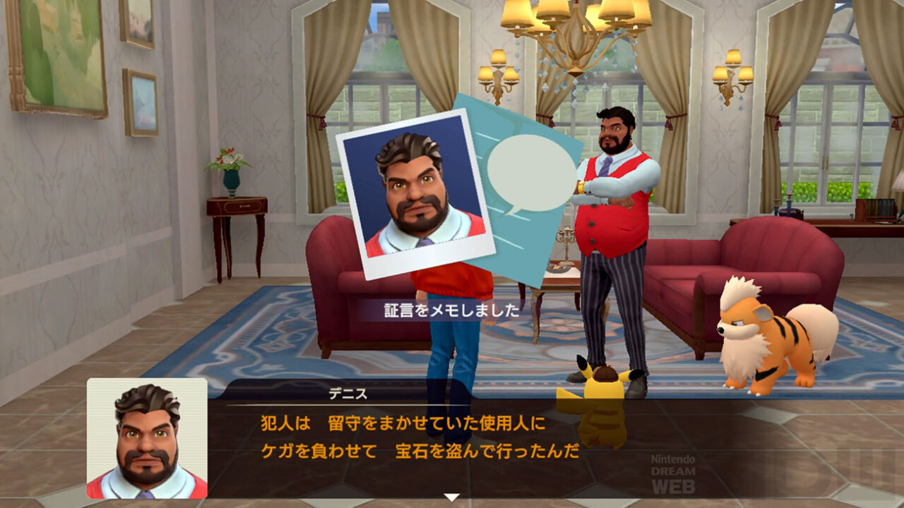 事件解決のヒントとなる証言や証拠は、事件現場を調べたり、人間やポケモンたちへ聞き込みをすることで集めることができるので、集めた証拠や証言を元に「推理ノート」を使って推理を組み立ていくことになります。