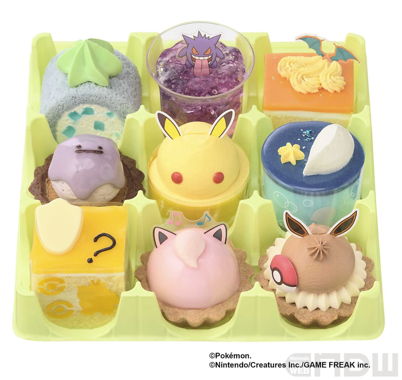 銀座コージーコーナーは、10まんボルトのようにパチパチ弾けるキャンディーが入ったピカチュウのケーキや、紫色のあやしいオーラを表現したゲンガーのゼリー、メタモンのカオを表現したタルトなど、それぞれのポケモンの特徴を活かした味わいや見た目に仕上げた9種類のプチケーキを発売します。