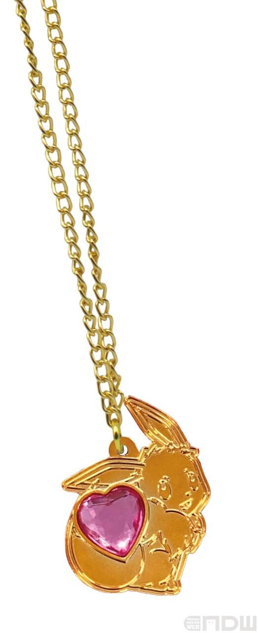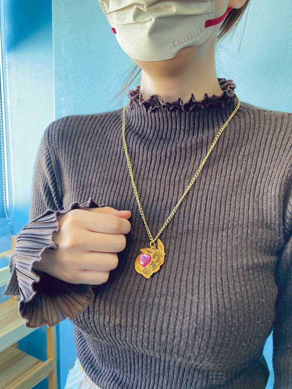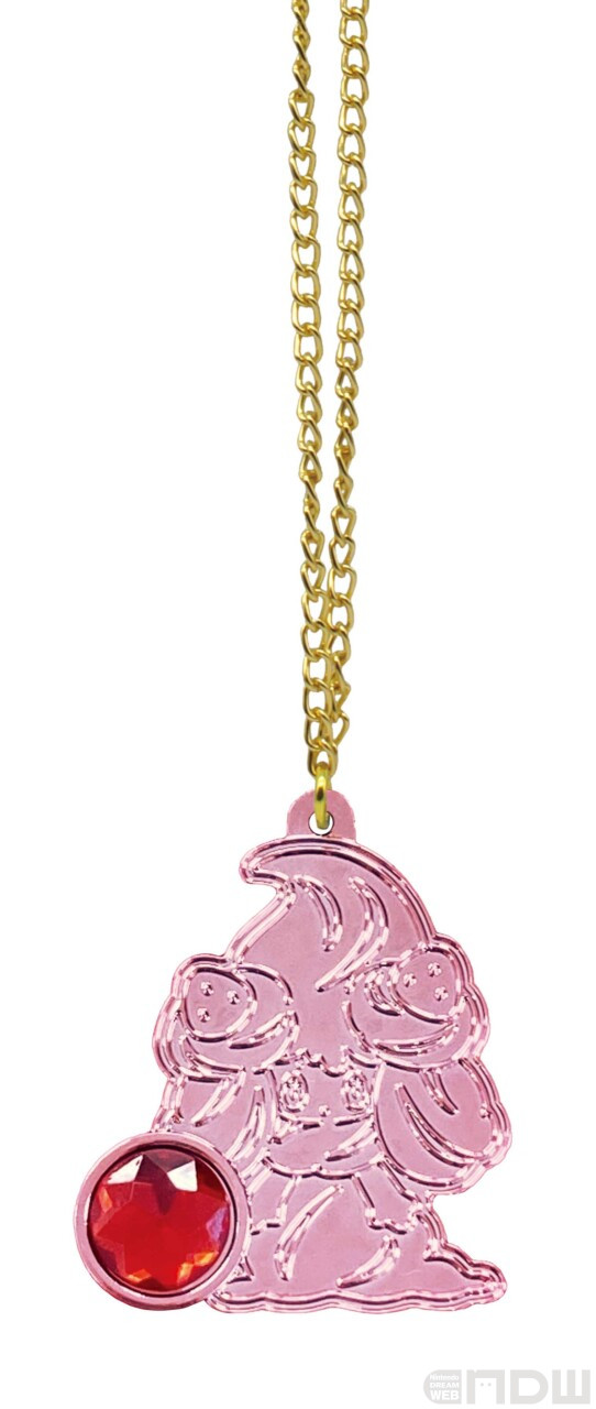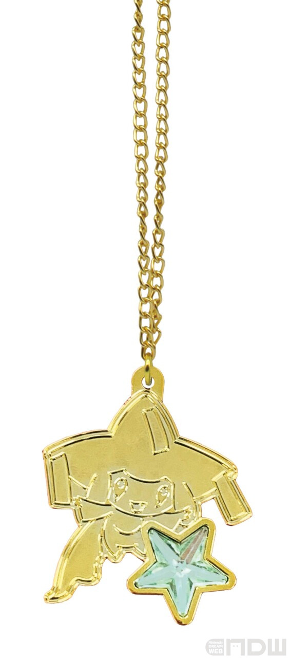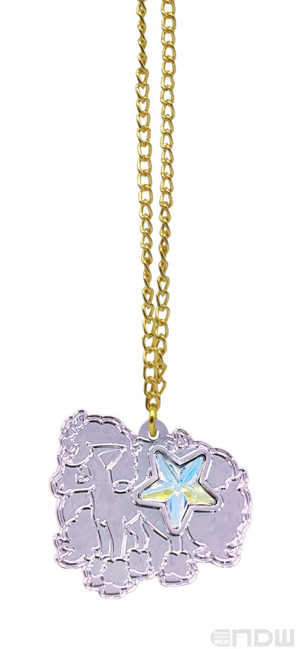 金メッキの本体にアクリパーツが付いたキラキラなペンダント。本体サイズは約45mmと、子供から大人まで身につけると存在感のある仕上がりとなっています。