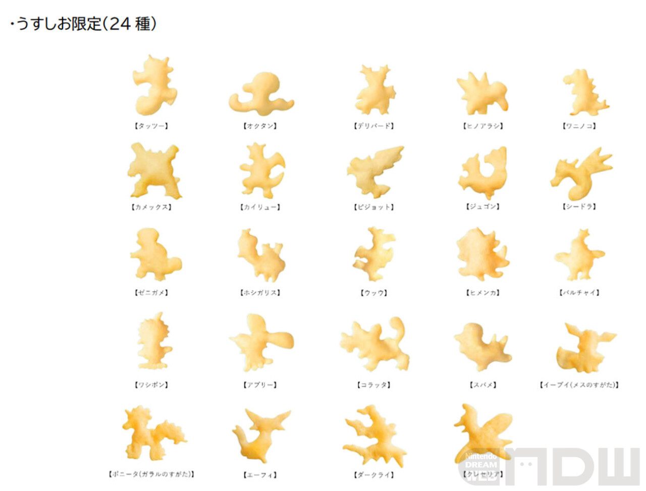 <うすしお味><コンソメ味>の2種類で、パッケージは全8種類。それぞれの味にしか登場しないポケモンの菓子型も存在します。すべてのパッケージは6月上旬から全国で発売されていきます。