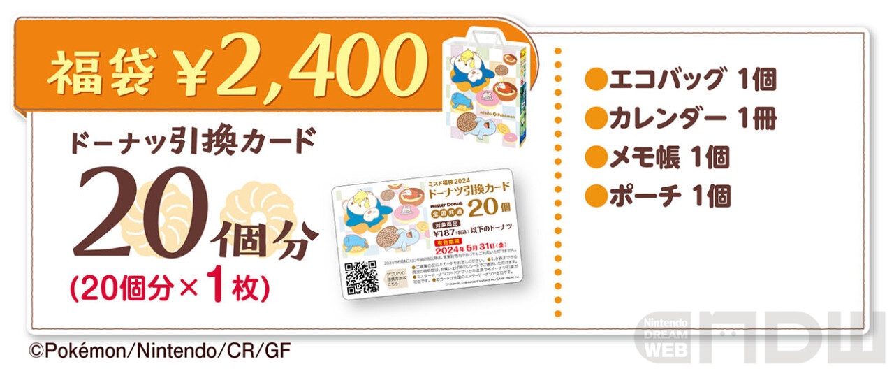 福袋のラインナップは、2,400円(税込)の福袋、3,600円(税込)の福箱、5,900円(税込)の福箱の3種類。ピカチュウやカビゴンをはじめ、ソーナンス、ヌオー、ホゲータ、ヌメラなど、限定のポケモングッズが入ったミスド福袋となっています。