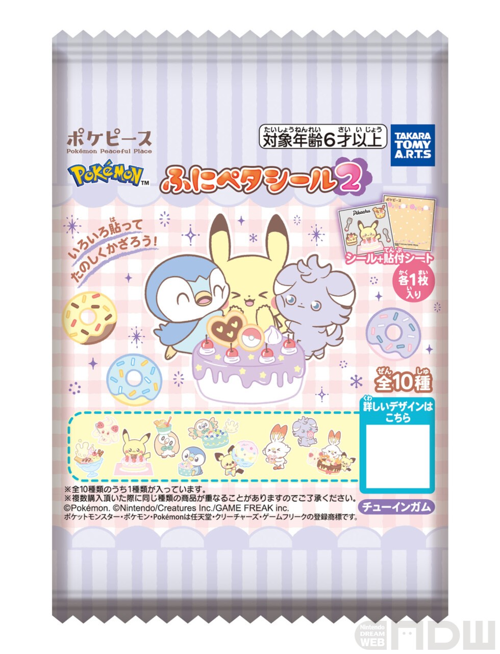 今回もシールを背景紙に貼って組み合わせて遊ぶだけでなく、いろいろな場所に貼って楽しめます。シールのラインナップは今回からマホイップが新たに登場。複数のポケモンがデザインされたシールも3パターン入った全10種類!