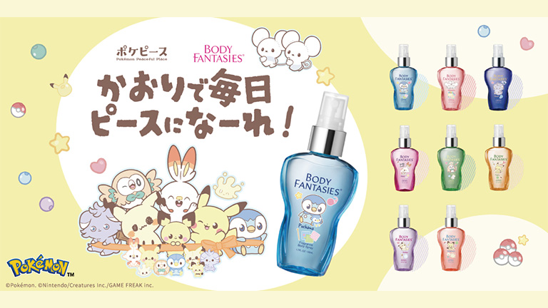 フィッツコーポレーションが手掛けるフレグランスブランド「ボディファンタジー」より、「ポケピース」デザインのボディスプレーが10月4日(土)から発売されます。
