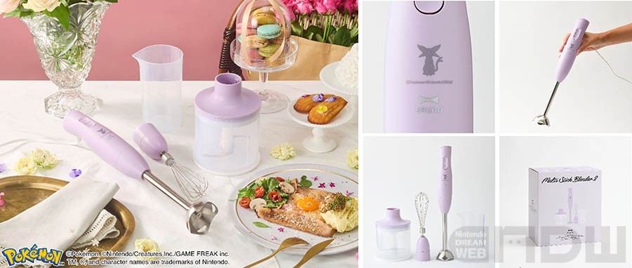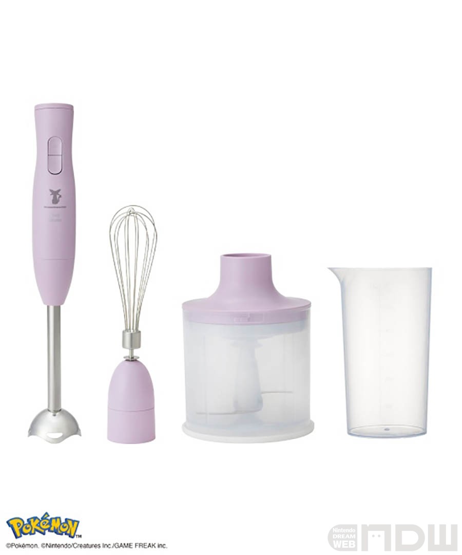 つぶす・混ぜる・刻む・砕く・泡立てるの1台5役のエーフィがデザインされた、パープルカラーのマルチスティックブレンダー。