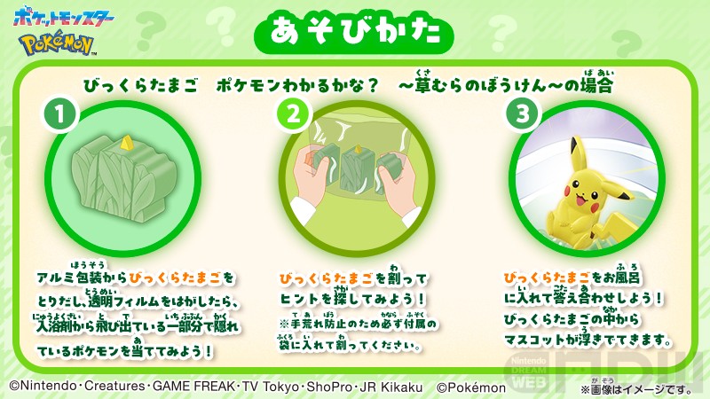 その第1弾となる「びっくらたまご ポケモンわかるかな? ~草むらのぼうけん~」は、草むらで出会えるポケモンたちがテーマとなっています。入浴剤は草むらの形をしており、そこからポケモンの体の一部が見えているので、どのポケモンが隠れているのかを予想します。分からなければ、入浴剤を専用の袋に入れて草むらをかき分けるように割ることでさらにヒントを探します。