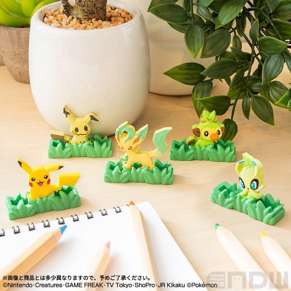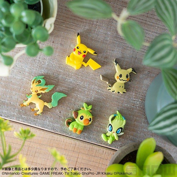 飛び出すポケモンは、ピカチュウ、ミミッキュ、リーフィア、サルノリ、セレビィの5種。台座のデザインは共通となっています。