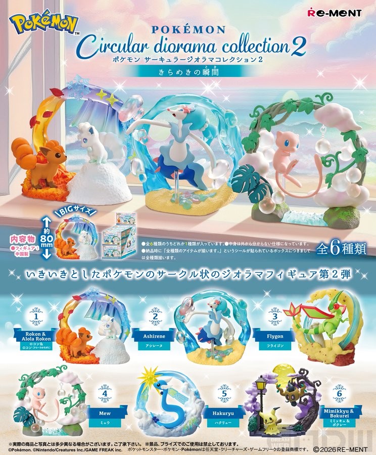 「ポケモン Circular diorama collection2〜きらめきの瞬間〜」のラインナップは、ロコン&ロコン(アローラのすがた)、アシレーヌ、フライゴン、ミュウ、ハクリュー、ミミッキュ&ボクレーの全6種類。2026年3月9日発売予定で、価格は1つ1,430円(税込)です。