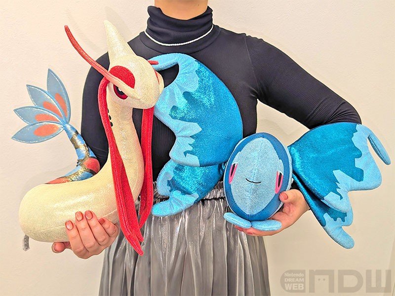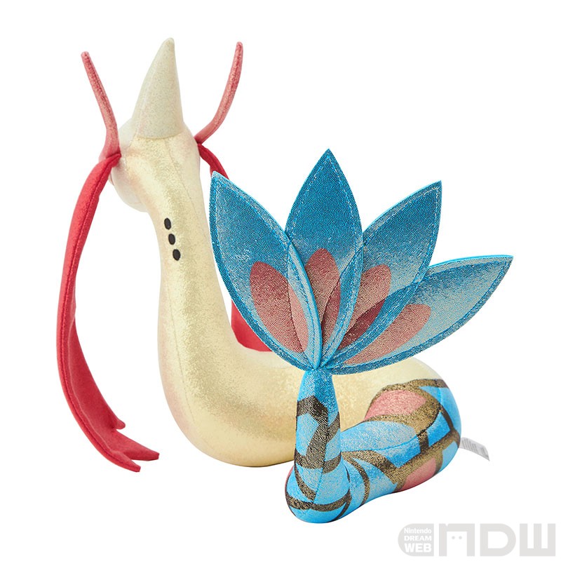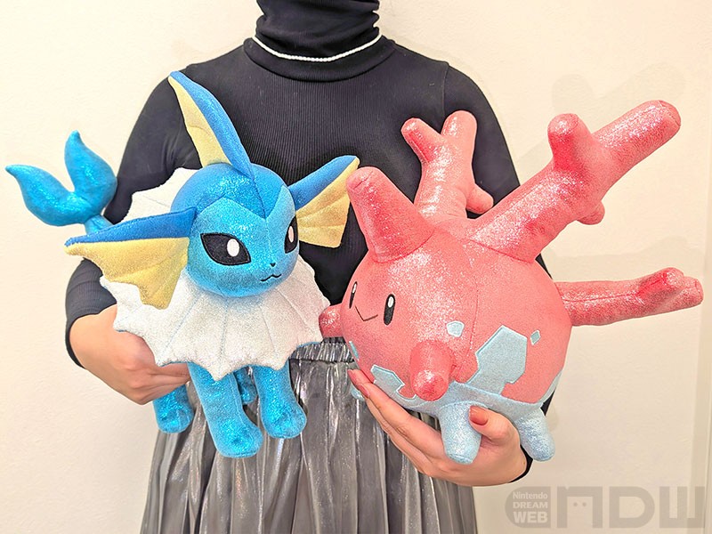 独特なツヤとラメ感が特徴の「キラリン☆グリッターぬいぐるみ」は、シャワーズ・サニーゴ・ミロカロス・ネオラントの4種類です。価格は各4,400円(税込)。