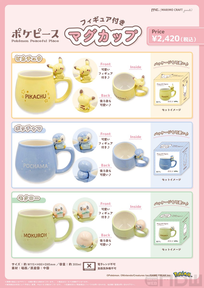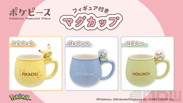 「ポケピース」のフィギュア付きマグカップは、ピカチュウ・ポッチャマ・モクローの全3種類。価格は各2,420円(税込)。