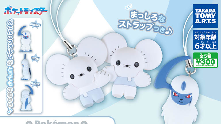 約5cmのぺたんこフォルムのストラップ付きマスコットシリーズ「ポケモン ぺたんこマスコット」。今回は白をテーマにしたポケモンたち、ワッカネズミ、ロコン(アローラのすがた)、ゾロア(ヒスイのすがた)、アブソル、フラエッテ(しろいはな)がラインナップされています。もちろんストラップも白色です。3月下旬より発売予定、価格は1回300円(税込)。