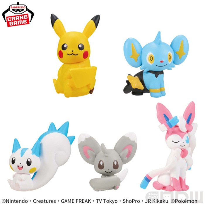 2026年3月18日(水)より順次登場予定 種類:全5種  サイズ:ピカチュウ:約3cm、コリンク:約3cm、パチリス:約3cm、チラーミィ:約3cm、ニンフィア:約4cm