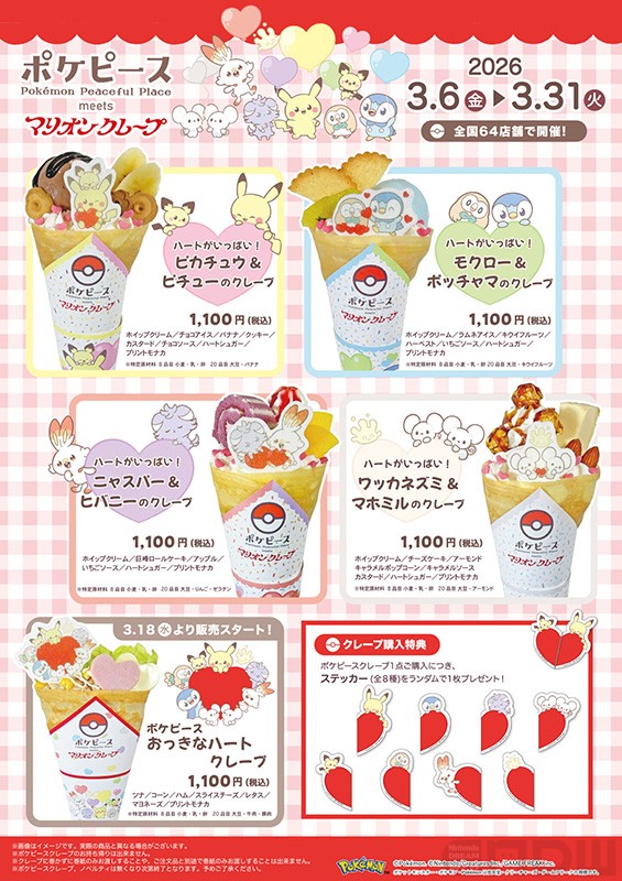 3月6日(金)~31日(火)の期間中に登場するのは、「ピカチュウ&ピチュー」「モクロ―&ポッチャマ」「ニャスパー&ヒバ二ー」「ワッカネズミ&マホミル」といった4種類のクレープです。その後、3月18日(水)〜3月31日(火)にかけて、5種類目の「ポケピース おっきなハートクレープ」が販売されます。価格は各1,100円(税込)。