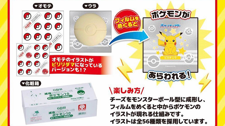 学校給食でも使用され、動物や乗り物の形に型抜きができる「型抜きチーズ」。今回はポケットモンスターとのコラボによって、チーズをモンスターボール型に成形。フィルムをめくるとポケモンのイラストが現れます。イラストの種類は、ピカチュウやエーフィなど全部で56種類。発売日などの最新情報については、公式X「ナカヤマフーズオンライン」をご確認ください。