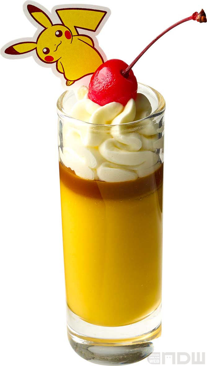 ■ピカチュウ フルーツモクテル:ピカチュウをモチーフにした大人デザインのモクテル(ノンアルコール)。フルーツジュースをミックスした、フレッシュな味わいをお楽しみください。