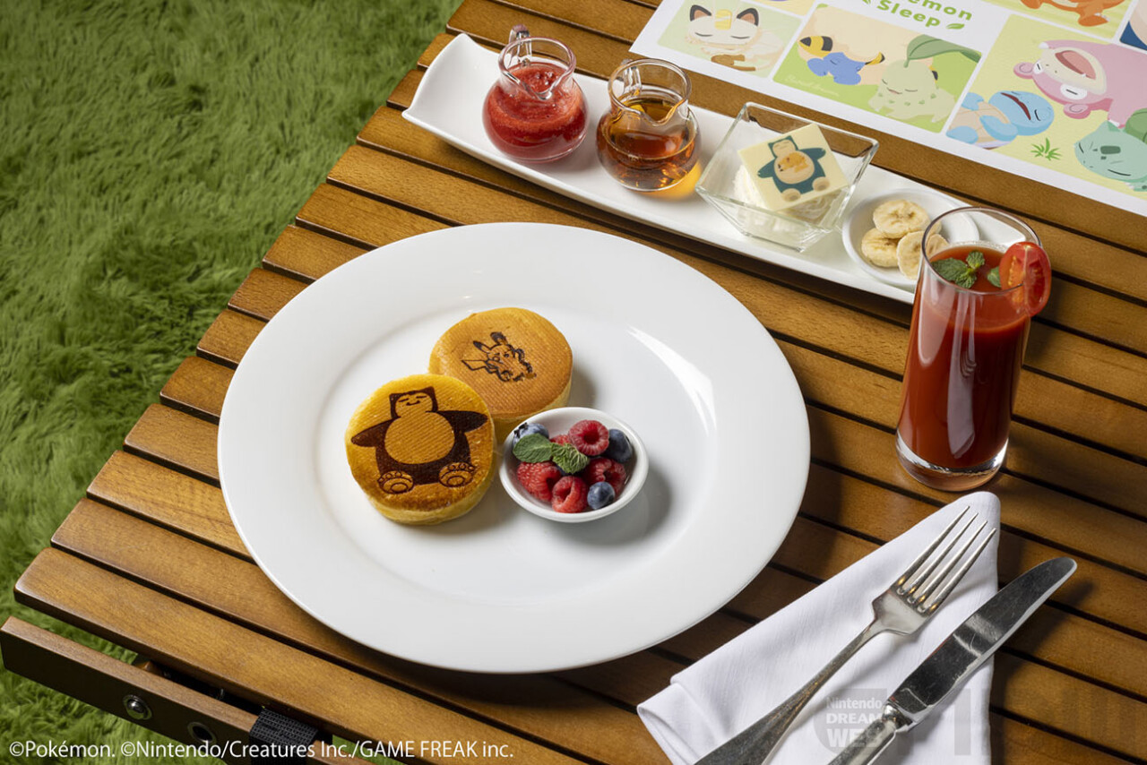 カビゴンとピカチュウの焼き印を入れたオリジナルパンケーキ、ゲームに登場する「マイペースやさいジュース」をイメージしたジュース付き