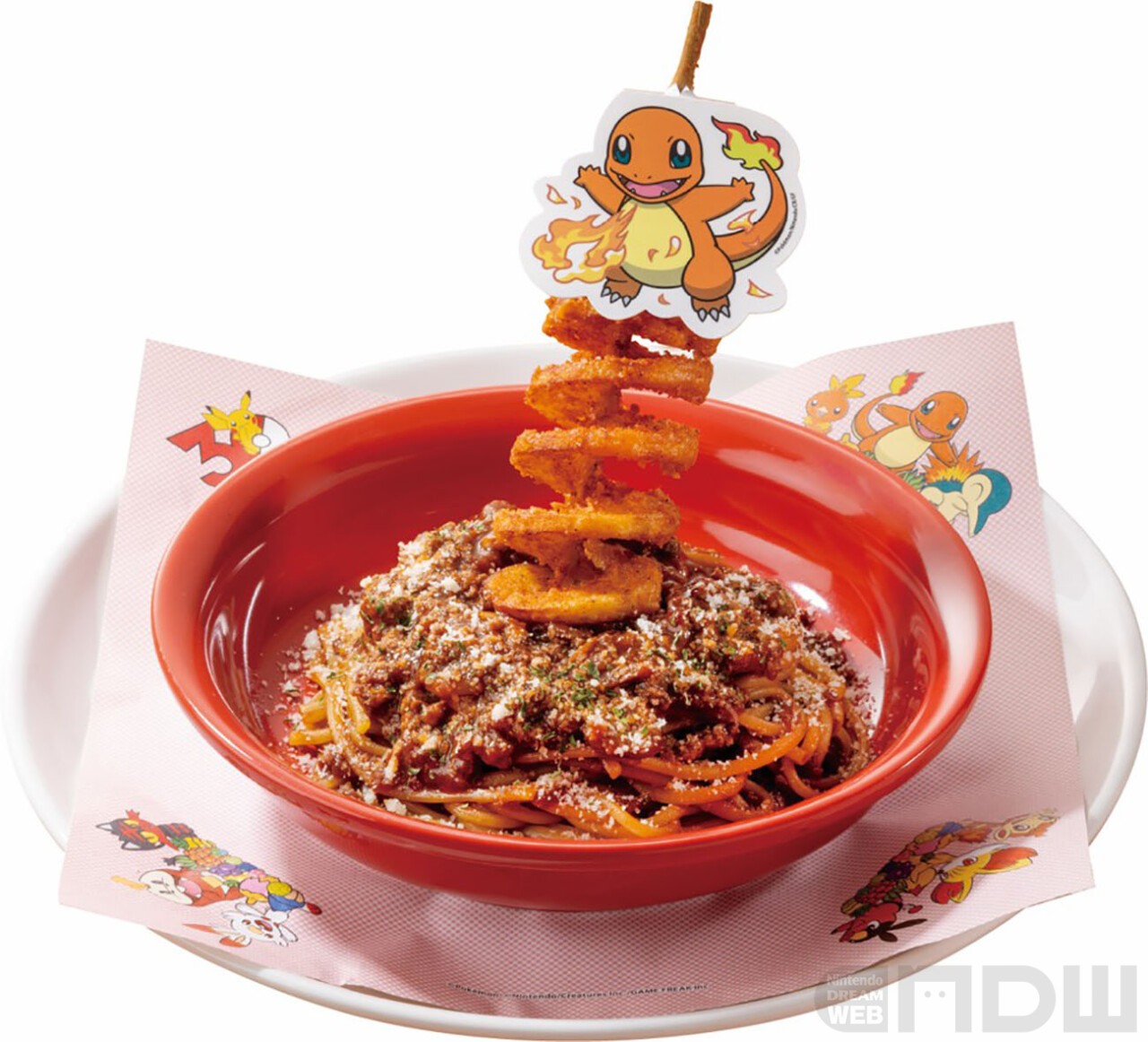 ヒトカゲのわざ「ほのおのうず」をトルネードポテトでダイナミックに表現したミートソースパスタ。
