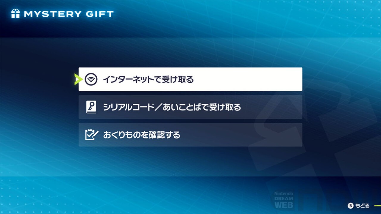 ゲーム内の「ふしぎなおくりもの」から「インターネットで受け取る」を選び、「特別な異次元のひずみを検知!」を選択します。
