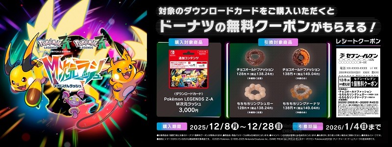 2025年12月8日(月)より、セブン-イレブン各店舗にて『Pokémon LEGENDS Z-A M次元ラッシュ』のダウンロードカードを購入すると、ドーナツの無料クーポンがもらえるキャンペーンが実施中です。
