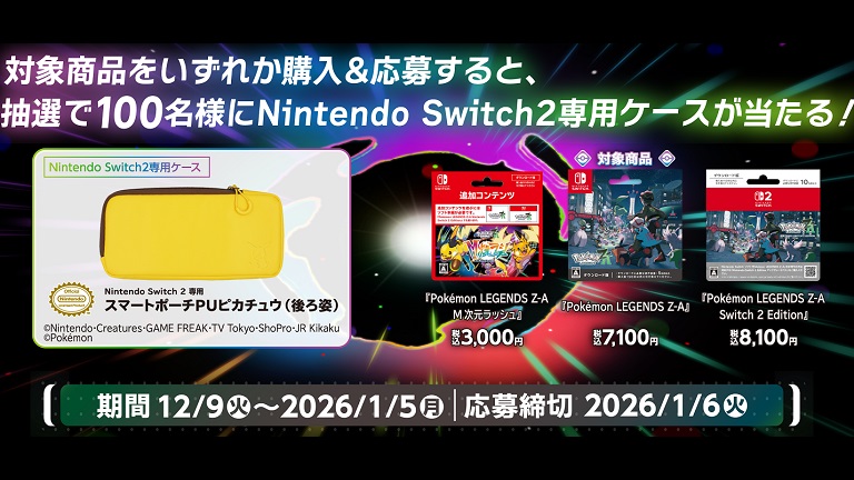 キャンペーン期間中に、対象店舗にて 対象商品(『Pokémon LEGENDS Z-A M次元ラッシュ』『Pokémon LEGENDS Z-A』『Pokémon LEGENDS Z-A Nintendo Switch2 Edition』)ダウンロードカードを購入し、キャンペーンサイトで応募すると、抽選で100名様に「Nintendo Switch 2 専用スマートポーチPUピカチュウ(後ろ姿)」がプレゼントされます。