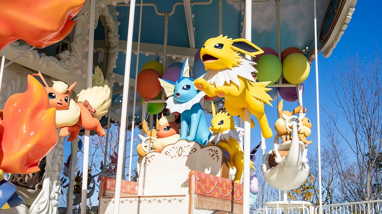 ブイブイヴォヤージュ」はイーブイたちとギャロップやポニータが引っ張る車に乗って、幻想的な旅が楽しるメリーゴーランド。