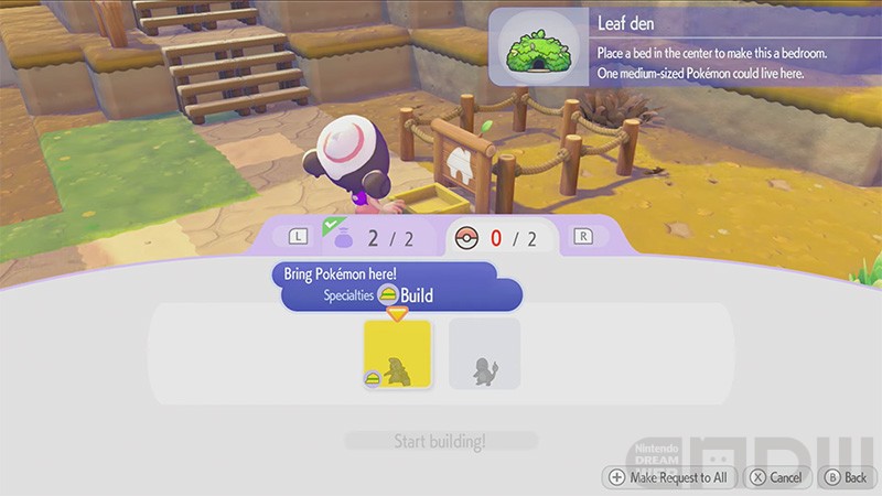 アイテム欄から「Leaf den kit(木の葉の家のけんちくキット)」を設置。その後は必要な素材を納品したり、手伝ってくれるポケモンを連れてきます。