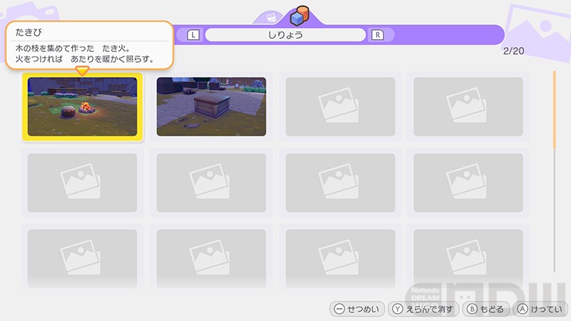 この「しりょう」の写真は20枚まで保存可能で、マイナスボタンを押すと、そのアイテムの説明も表示されますよ。どんなアイテムかすぐ知りたい時に撮影するとべんりですね!
