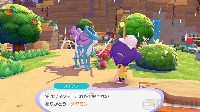 しかも、スイクンは連れ歩きが可能。ゆめしまから移動しても、いっしょについてきてくれます。食べ物をあげたり、お手伝いをしてもらったりと、ほかのポケモンたちと同じように街の暮らしを楽しんでくれました。
