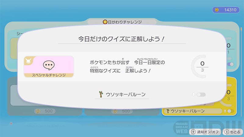 それぞれ話しかけてクイズに3回正解すると、チャレンジ条件達成! パソコンから「ウソッキーバルーン」を受け取ることができました。ちなみに、ポケモンたちはチャレンジ達成後も引き続きクイズを出してくれます。