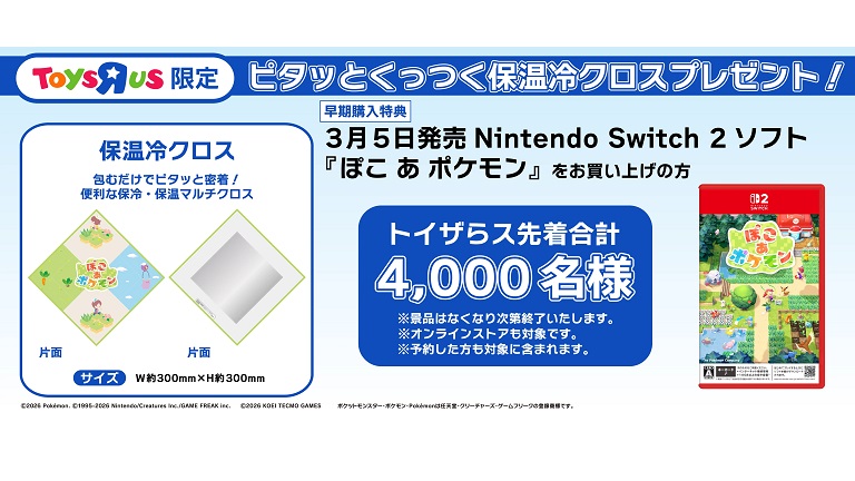 全国のトイザらスにて、Nintendo Switch2ソフト『ぽこ あ ポケモン』を購入すると、先着4,000名に保温冷クロスがプレゼントされます。