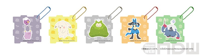 メタモン&フワンテ、ピカチュウ(うすいろ)、カビゴン(こけむし)、ルカリオ、モジャンボ(はかせ)の全5種がデザインされたアクリルパズルキーホルダーです。