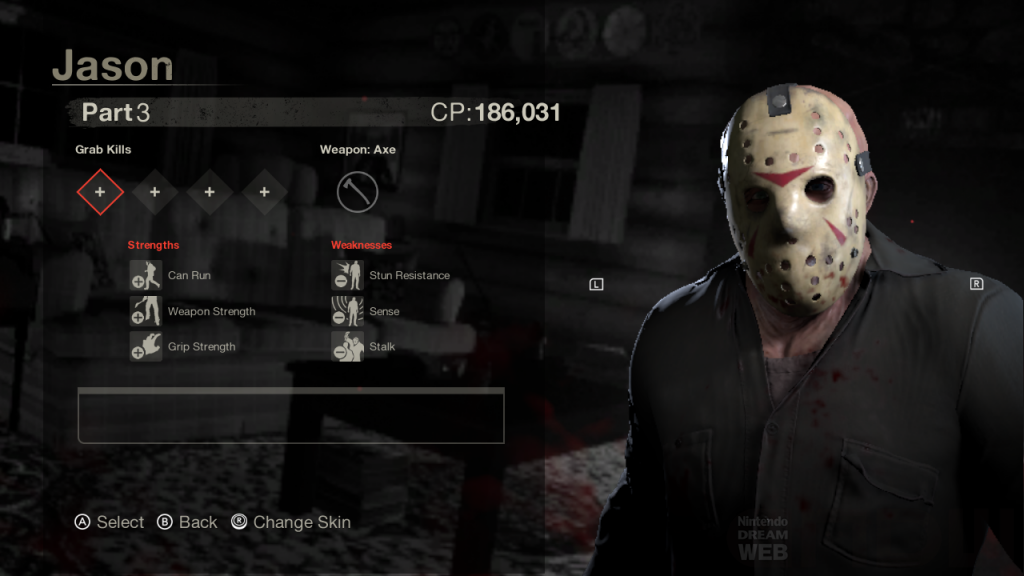 ↑映画の第2作~第9作までに登場した計8人のジェイソンを操作でき、それぞれ見た目や能力も異なる。ちなみに1作目のジェイソンがいない理由は「本当はジェイソンじゃないから」(ネタバレ)