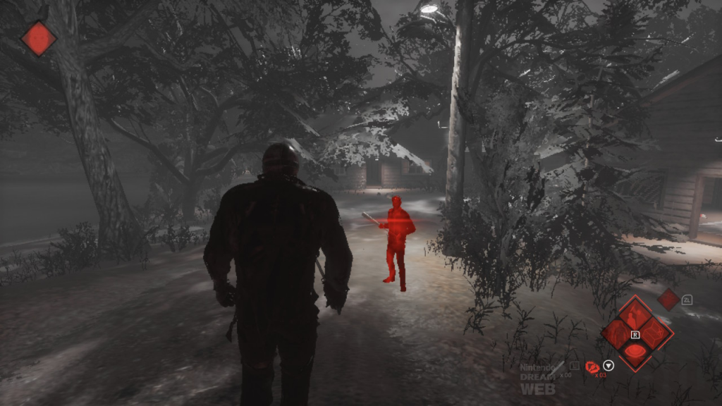 ロブ ジェイソンとしてプレイするときは、他の7人のカウンセラーをいかにして追い詰めていくかというゲームになります。プレイすればするほど、いろいろな殺しの技(グラブキル)が増えていきますので、バラエティに富んだ「殺戮」ができるようになるのも楽しみの1つです。
