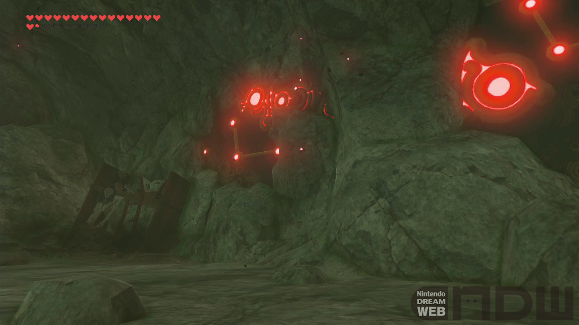西側には洞窟があり古代遺物の壁が露出している…位置的にガノンと戦うあの地下空洞!? 採掘道具らしきものもある