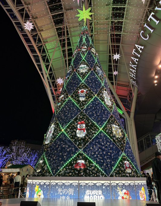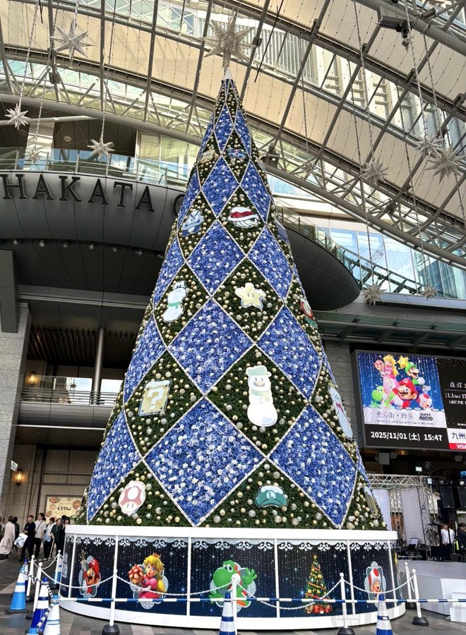 JR博多シティ駅前に、巨大なマリオツリーが出現! 点灯式ではスーパーマリオのメドレーが演奏され、マリオとルイージが登場しました。