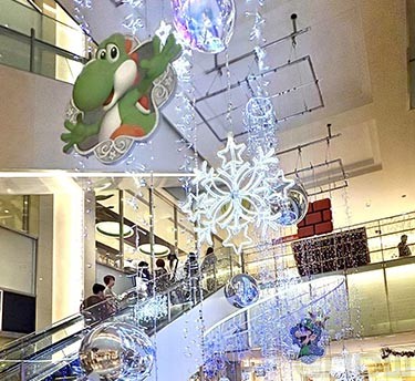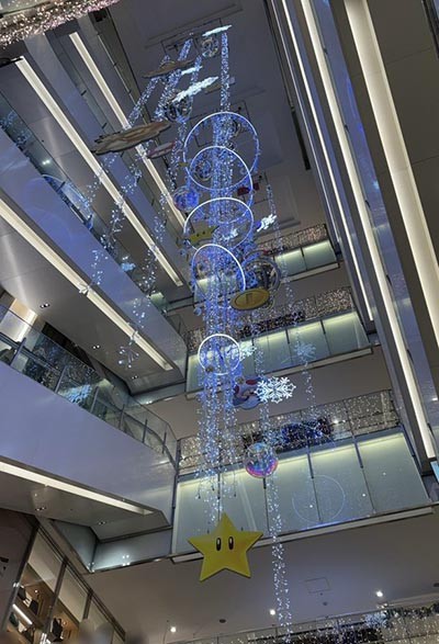 3階インフォメーション前の吹き抜けにある巨大シャンデリア。ここにもマリオ装飾が。