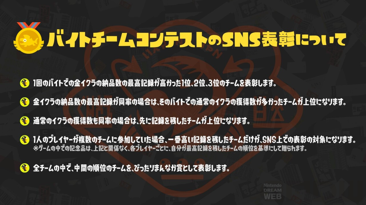 公式Twitterで発表された「バイトチームコンテスト」は、フレンドやチャンネルのメンバーとチームを組んで、固定されたシナリオでの金イクラ納品数のハイスコアを競い合う、クマサン商会の社内イベント。