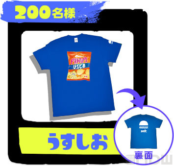 対象期間中に対象商品を購入して応募すると、抽選で総計600名に「ポテトチップスフェス」フェスTシャツが当たるキャンペーンが実施されます。フェスの陣営それぞれのフレーバーのTシャツになっていますね。