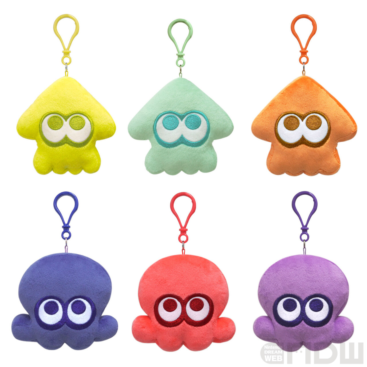 イカとタコ、それぞれゲームのアイコンをモチーフとしたぬいぐるみマスコット。カラー展開は、イカがイエロー・ライトブルー・オレンジの3色、タコがブルー・レッド・パープルの3色となります。