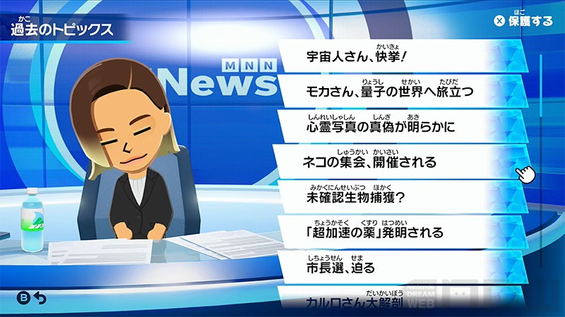 島での日々の出来事がニュースになって放送されます。一度見て気になったニュースは、後から見返すことも可能です。