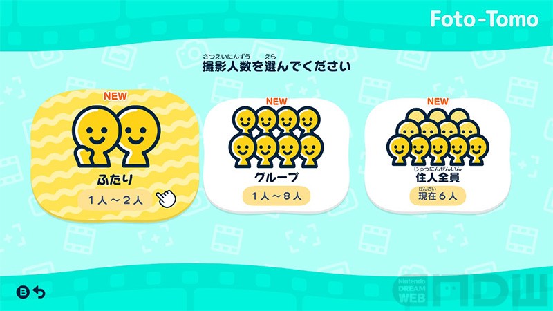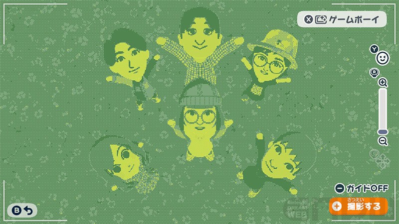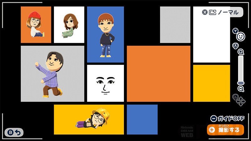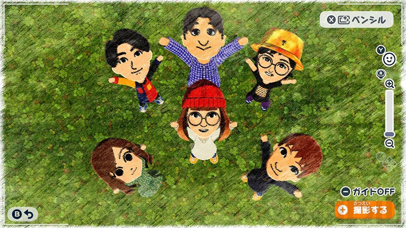 撮影人数に「住人全員」を選ぶと、Miiたちを自動で綺麗に並べてくれて便利でした。フィルターの質感も面白くて、さまざまなスタイルでの撮影をお試し。