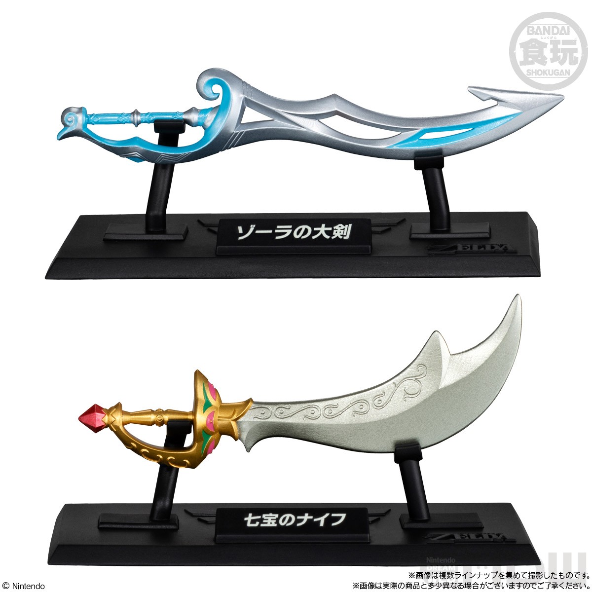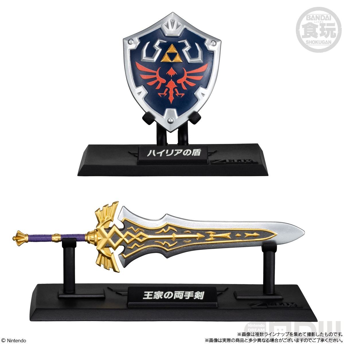 手のひらサイズながら、作り込まれた『ゼルダの伝説』に登場する武器や盾の彩色済みフィギュアとガム(ソーダ味)がセットになった食玩。専用の台座が付属され、台座にはタイトルロゴが刻印されています。