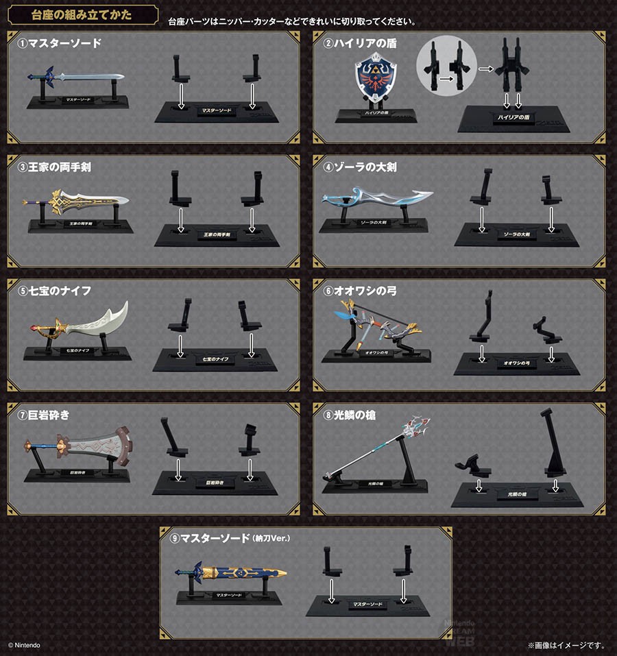 ラインナップはマスターソード、ハイリアの盾、王家の両手剣、ゾーラの大剣、七宝のナイフ、オオワシの弓、巨岩砕き、光鱗の槍、【レア】マスターソード (納刀Ver.)の全9種類。マスターソードは組み合わせて楽しむことも可能です。