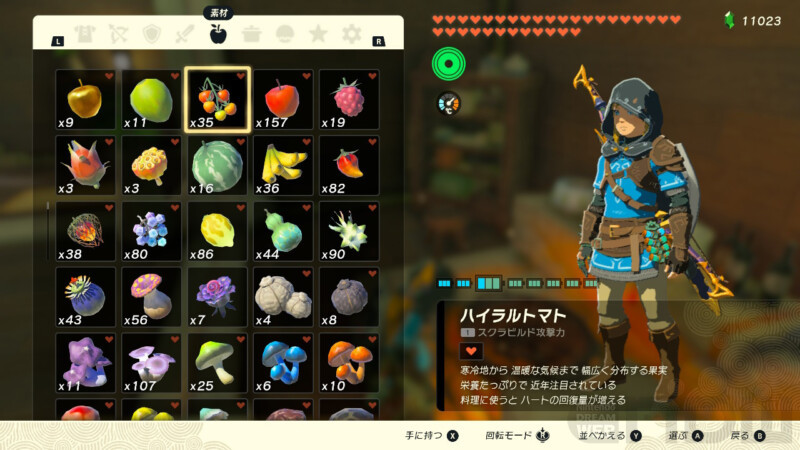 大量のハイラルトマトと組み合わせて料理をすれば効率アップ!簡単にハート回復量10個の料理をゲットできます。